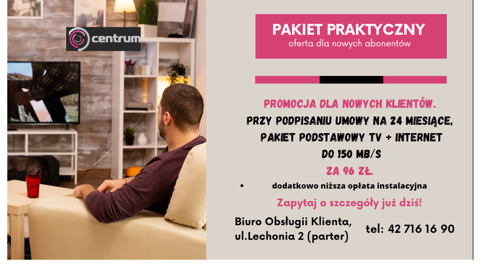 Pakiet Praktyczny to idealna oferta dla nowych abonentów – telewizja podstawowa i szybki internet do 150 Mb/s już za 96 zł miesięcznie. Dodatkowo zyskujesz niższą opłatę instalacyjną i pełne wsparcie techniczne.